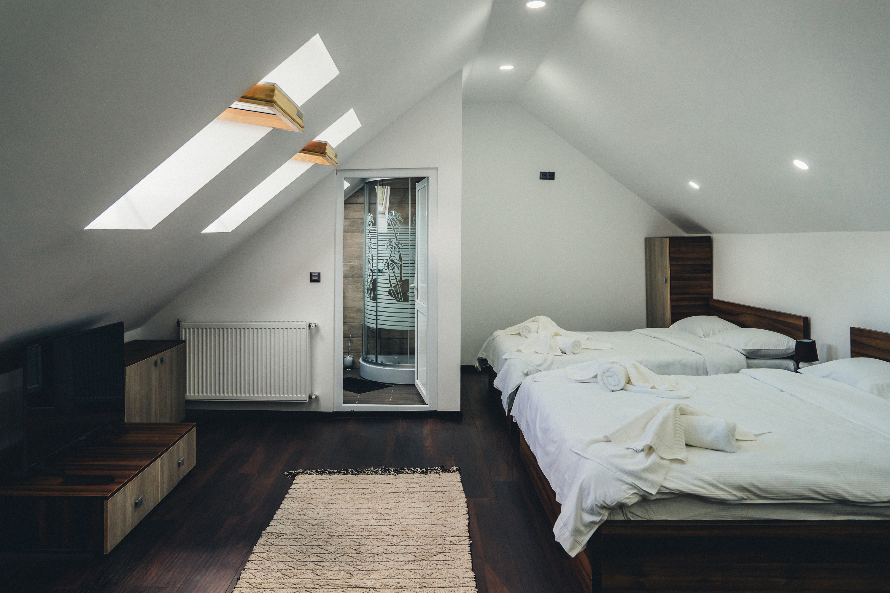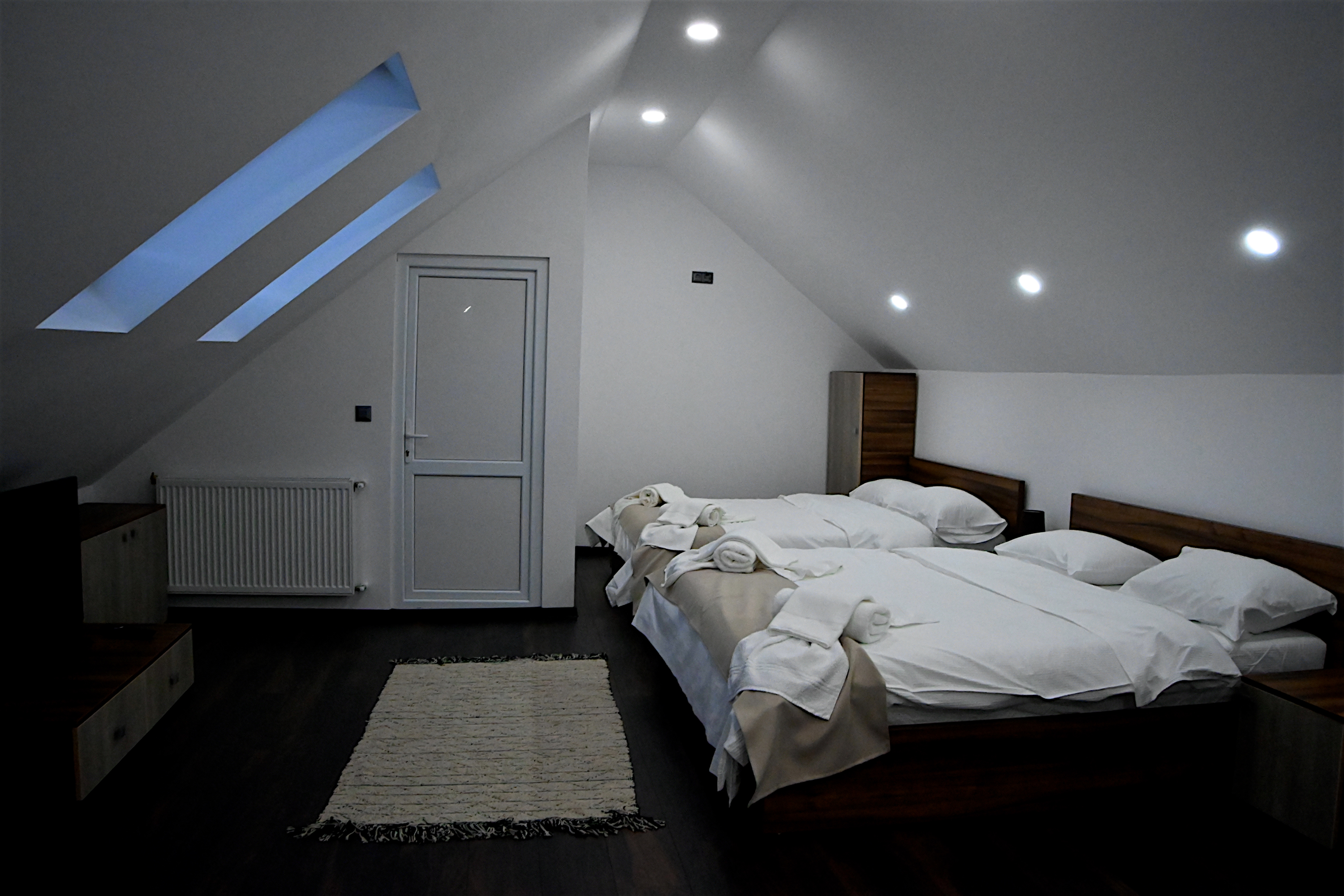 Amenajate in stil modern si elegant, spatiile de cazare sunt dotate cu bai proprii, 2 paturi cu saltele ortopedice (160X200cm) la etaj , 1 Pat (160X200cm) cu saltea ortopedica camera privata , mini hol, perne antialergice, televizor LCD, internet cablu si WI-FI, minibar, uscator de par, balcon sau fereastra ce va permit sa simtiti aerul curat de munte.