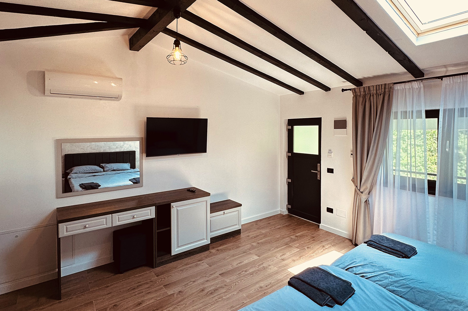 Amenajate in stil modern si elegant, spatiile de cazare cu 3 locuri sunt dotate cu bai proprii, 1 pat cu saltea ortopedica (160X200cm), 1 pat (90X200cm) cu saltea ortopedica , perne antialergice, televizor LCD, internet cablu si WI-FI, minibar,uscator de par, balcon sau fereastra ce va permit sa simtiti aerul curat de munte.