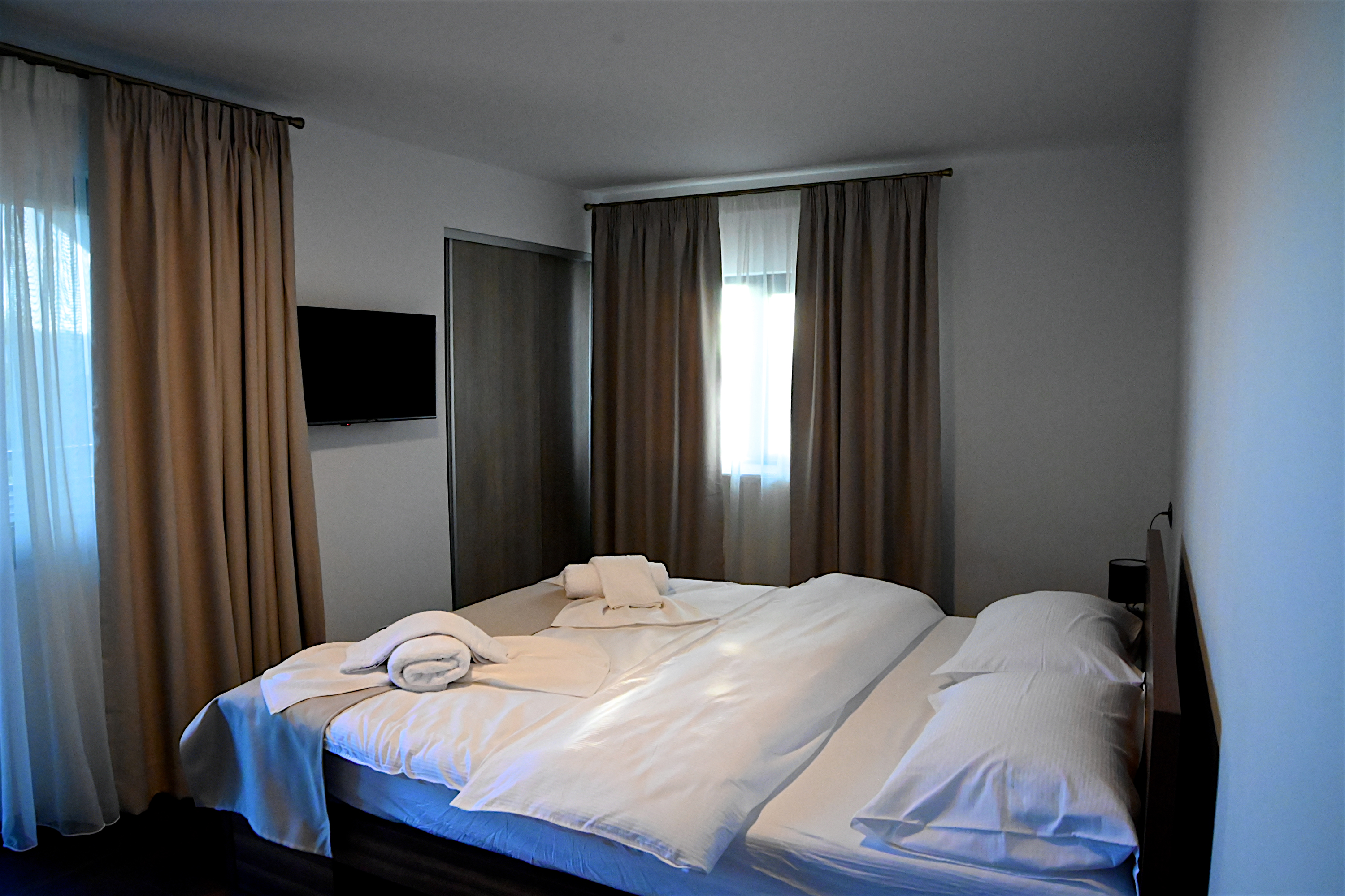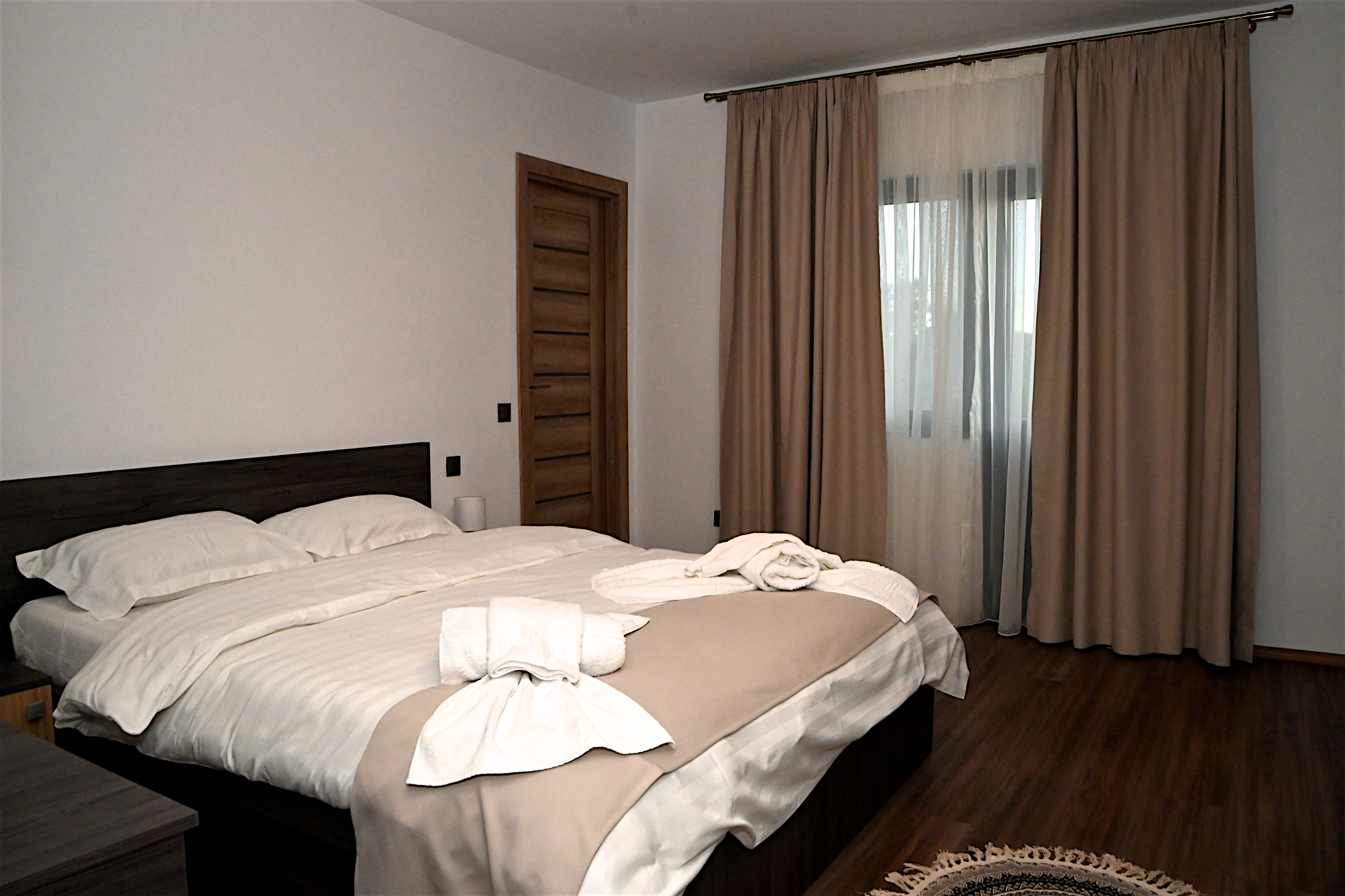 Amenajate in stil modern si elegant, spatiile de cazare sunt dotate cu bai proprii (baie spatioasa), 1 pat modern cu saltea ortopedica (160X200cm), perne antialergice, televizor LCD, internet cablu si WI-FI, minibar, uscator de par, balcon cu view minunat ce va permit sa simtiti aerul curat de munte.
